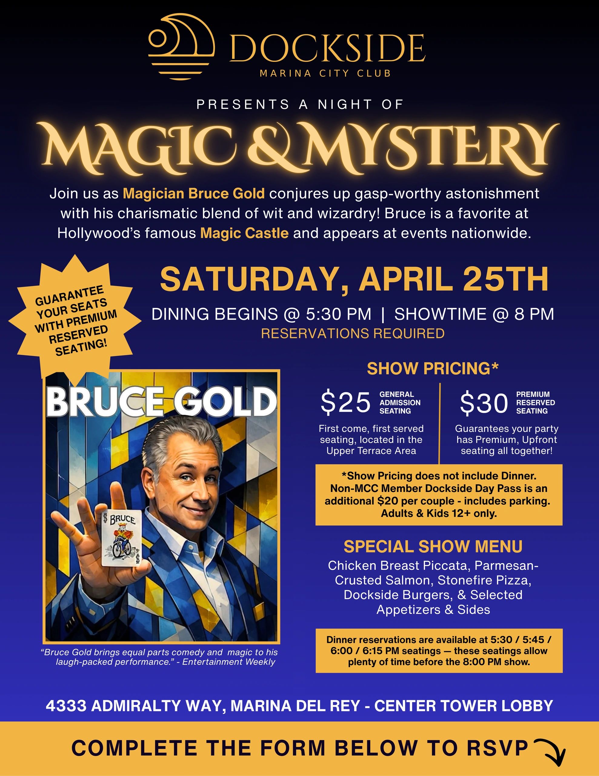 *Show Pricing does not include dinner. Non-MCC Dockside Day Pass is an additional $20 per couple - parking included. Adults & Kids 12+ only.